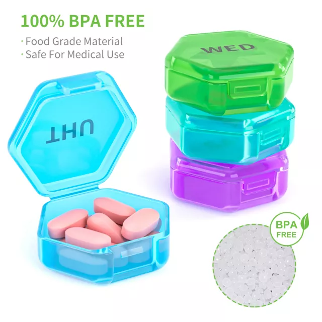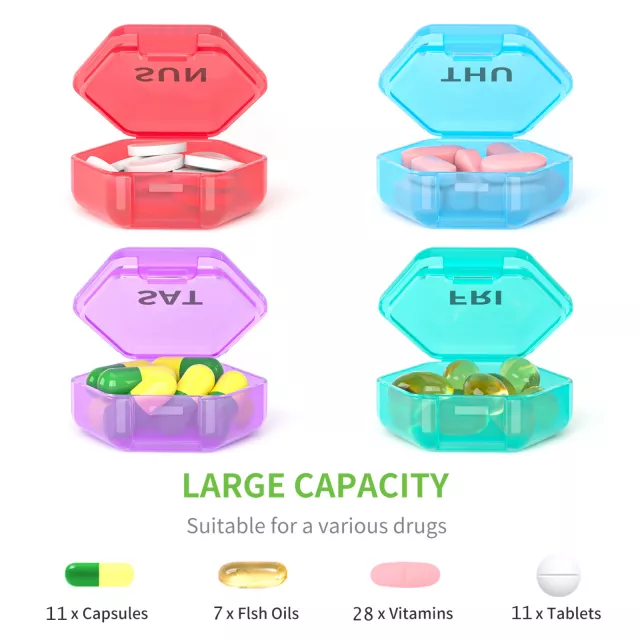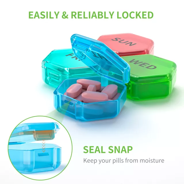 • 7 individual compartments – One for each day of the week, with colorful lids for easy separation.