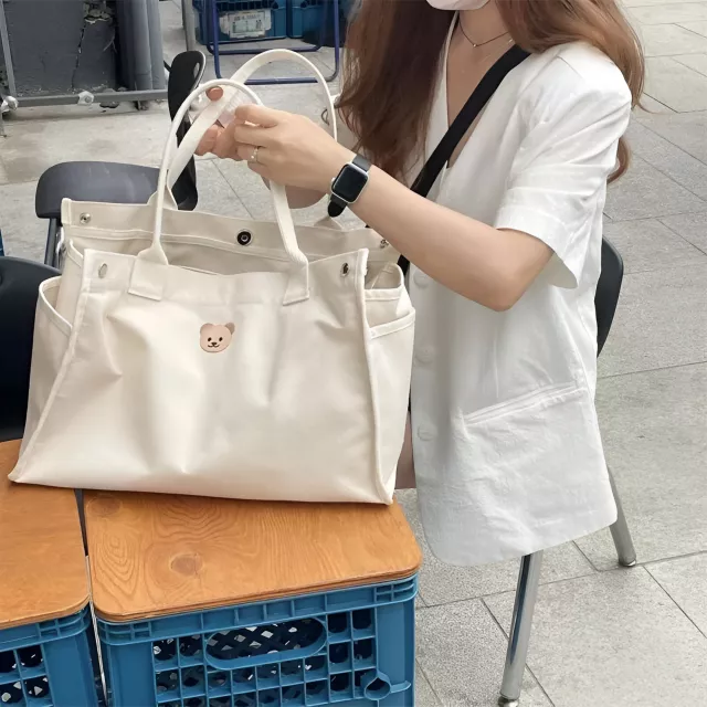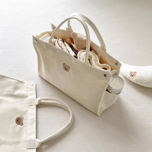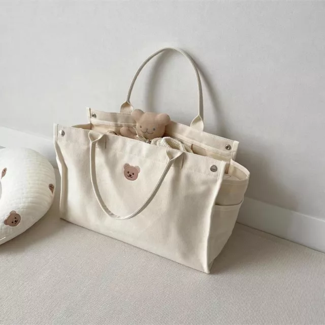 This Mommy Bag Canvas Diaper Bag is the ultimate blend of functionality and style. The large, roomy interior allows you to store everything you need for your baby, from diapers and wipes to bottles and snacks, all in one place. No more scrambling to find your baby’s essentials in a cluttered bag. Plus, the sleek white color and cute bear embroidery design make it a fashionable accessory that complements any outfit.