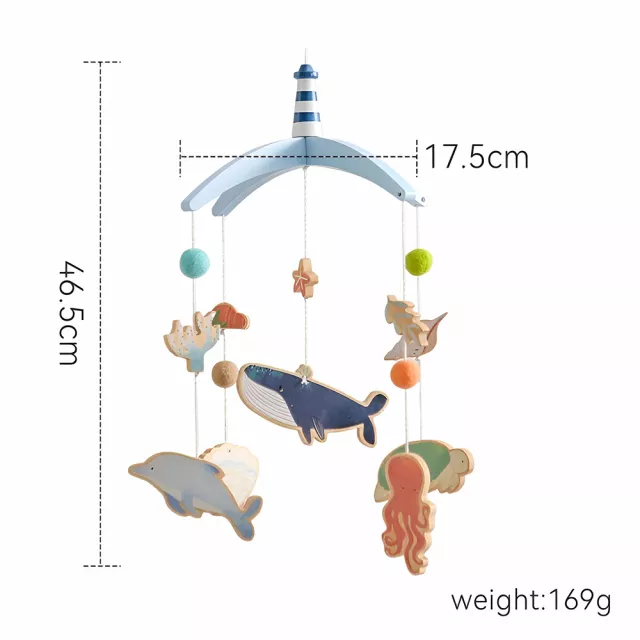 This baby crib mobile combines style, function, and comfort. Crafted from smooth, natural wood, it features plush stuffed ocean animals like whales and sea creatures that hang securely from a wooden bracket. Each piece is made with baby-safe materials and built to be durable and gentle on tiny hands. At 22.4 inches in height and 15.3 inches in width, it fits perfectly above standard cribs, creating a cozy and calming environment for your little one.