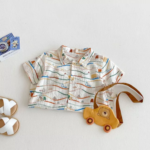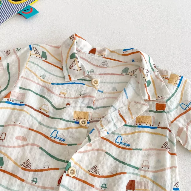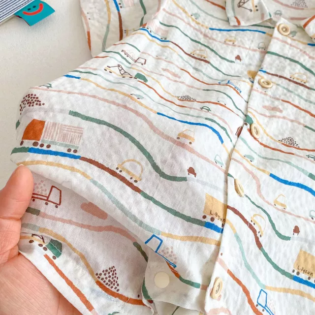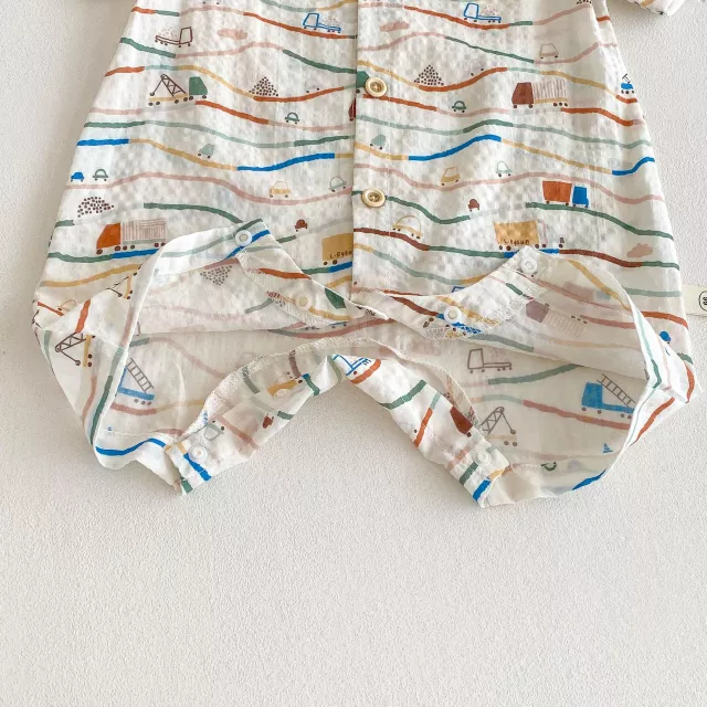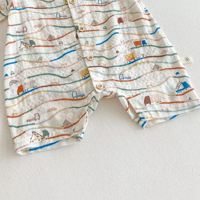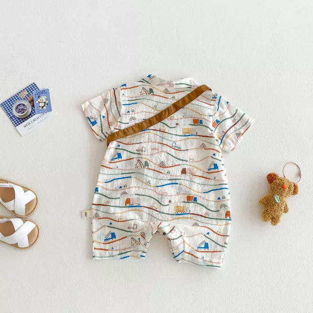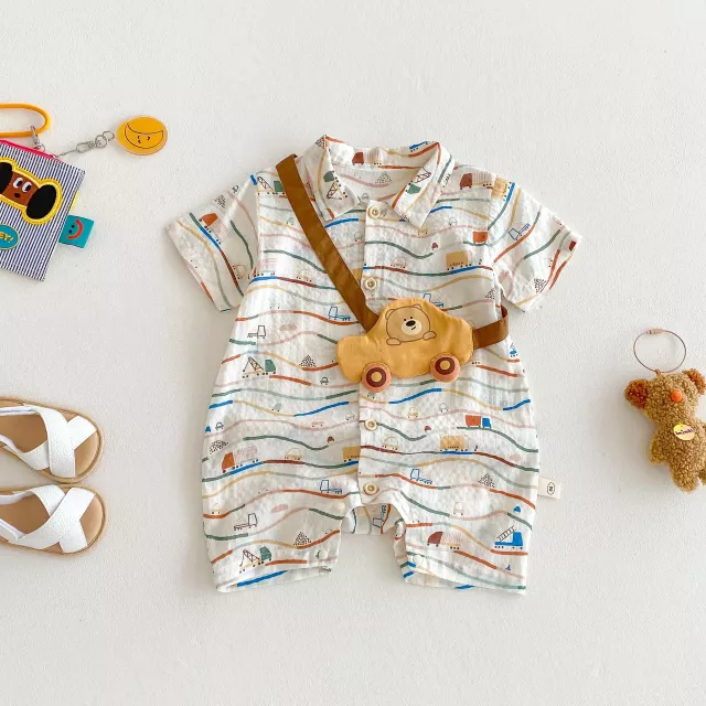 What truly sets this romper apart is its vibrant all-over cartoon print featuring colorful trucks, construction machines, and wavy road lines that are sure to captivate your baby’s curious eyes. It also comes with an irresistibly cute crossbody bag shaped like a car with a tiny bear inside — a playful accessory that adds extra charm and fun to your baby’s outfit.