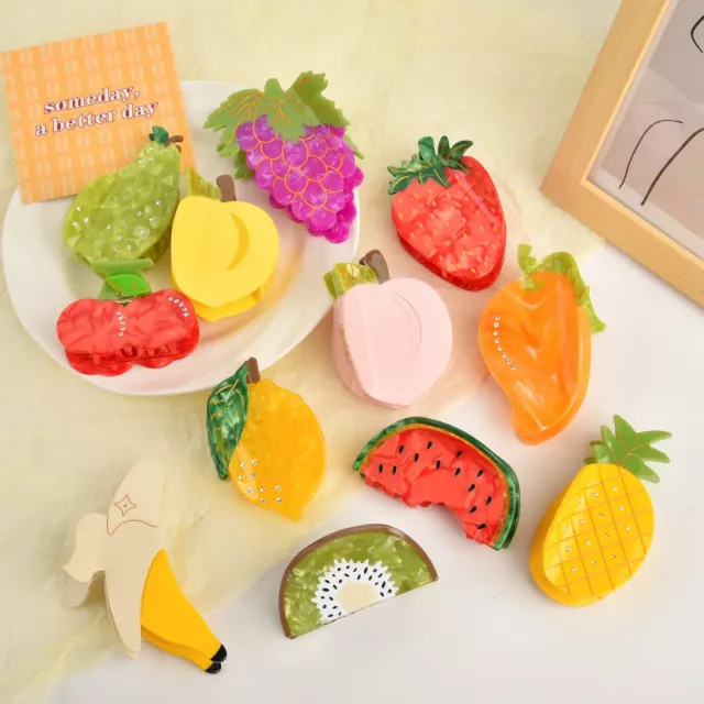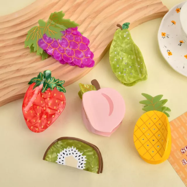 Each clip features a detailed fruit-inspired design with vibrant colors and smooth edges, offering a cheerful aesthetic while delivering a practical hold. Lightweight yet durable, these stylish claw clips comfortably grip your hair without tugging or slipping, making them suitable for all-day wear. Perfect for teens, women, and anyone who loves to show off their playful side, these fruit clips are as functional as they are fashionable.