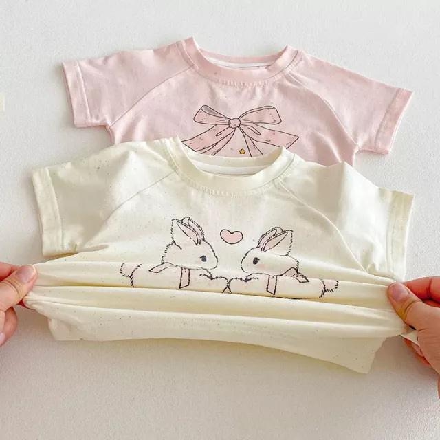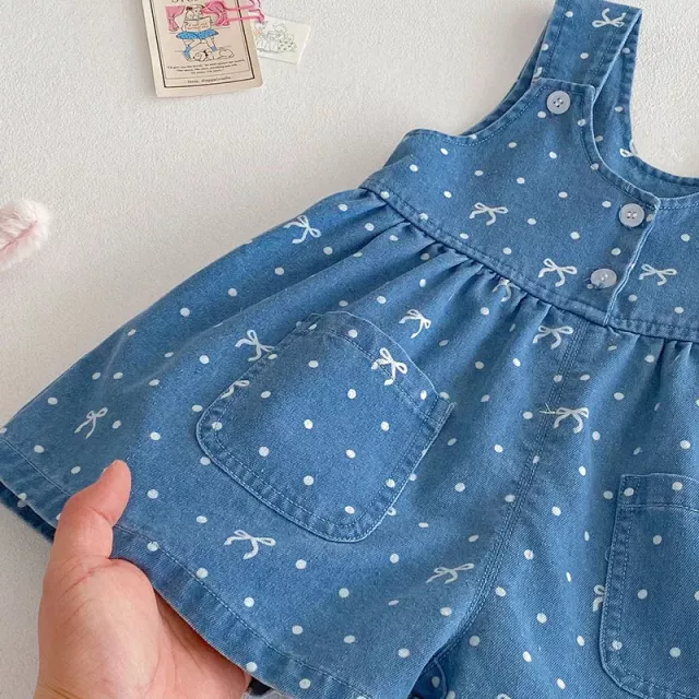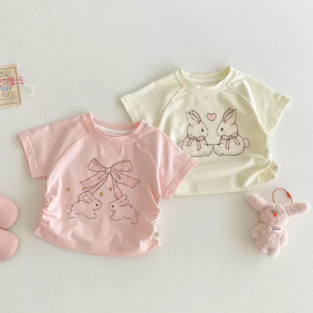 The T-shirt comes in two delightful designs – one with a bunny and sparkly stars, the other with bunnies and a heart – bringing a whimsical vibe that’s perfect for little fashionistas. The side drawstring adds a stylish ruched effect while allowing for a personalized fit. Paired with blue denim overalls featuring white polka dots and printed bows, this combo is cute, comfortable, and easy to mix and match. Whether she’s off to daycare, a birthday party, or a weekend outing, this outfit is a go-to summer essential.