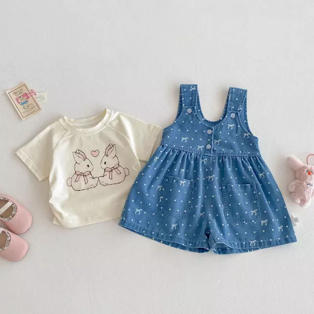 Let your little one shine this summer with this irresistibly cute girls’ outfit featuring a playful bunny T-shirt and classic denim overalls. Designed for kids who love to move, laugh, and explore, this two-piece set blends adorable design with everyday comfort. With cartoon prints full of character, sweet bow accents, and soft, breathable fabric, this outfit is made to keep your child looking stylish and feeling great through every sunny adventure.
