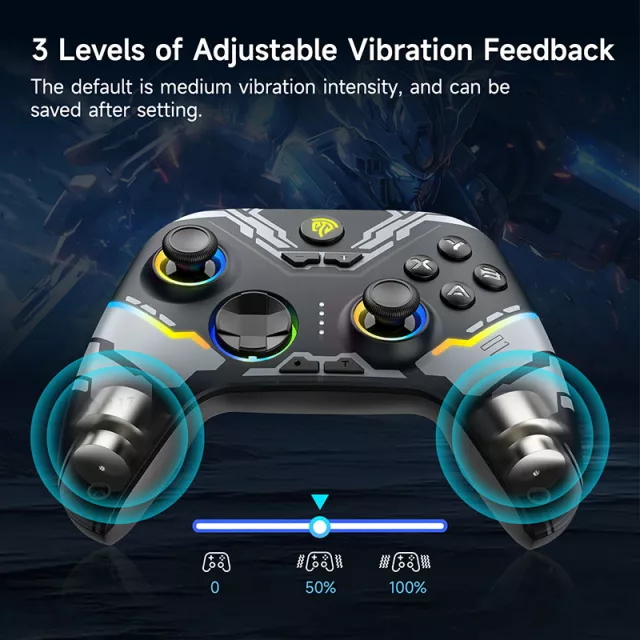 • Vibration Adjustment: Fine-tune your gaming experience with three vibration levels (0%, 50%, 100%) for immersive feedback tailored to your preference.